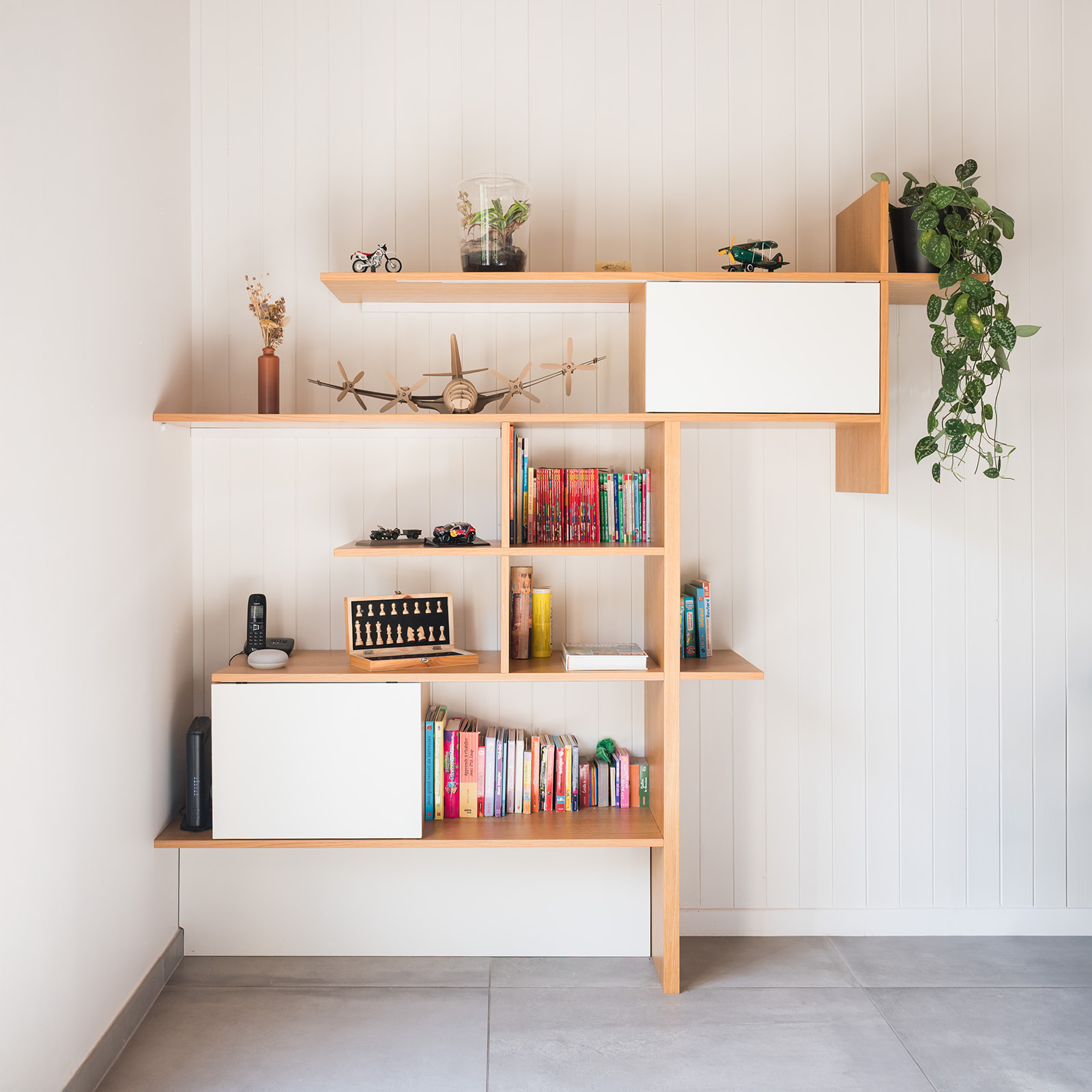 Nous avons intégré des meubles hauts pour maximiser le rangement tout en étant à hauteur d’homme.
