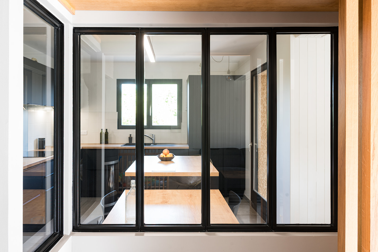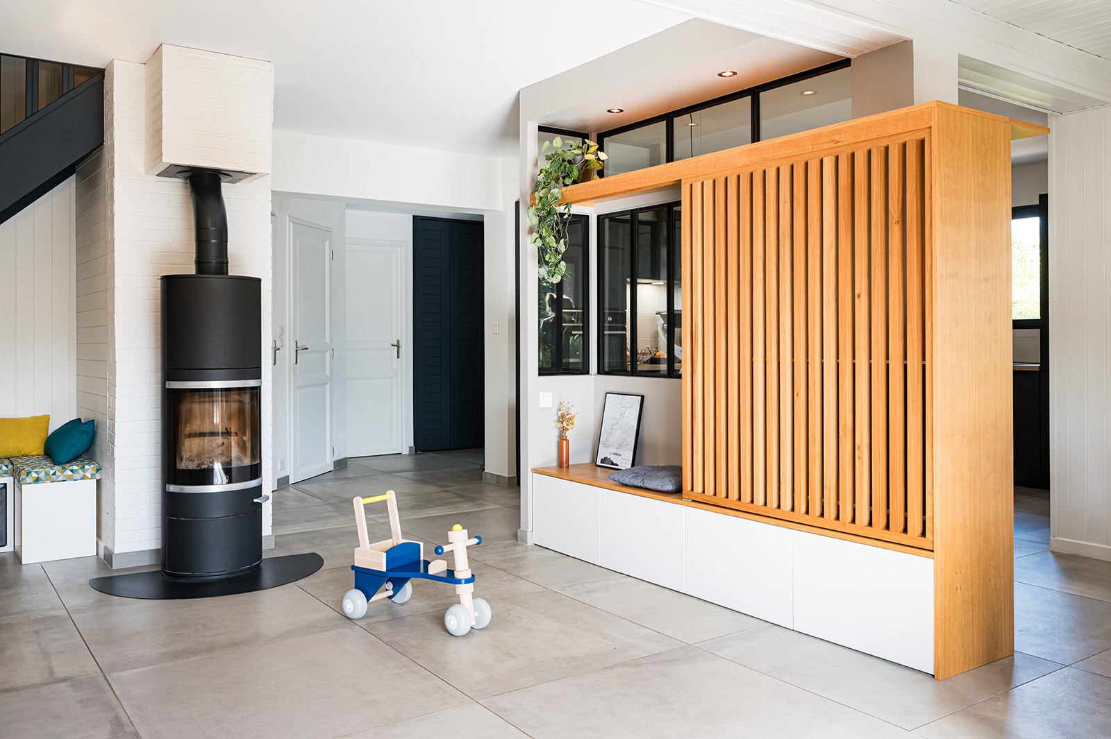 L’espace entre la salle à manger et la cuisine a été créé pour faciliter la circulation entre ces deux pièces. Le poteau existant a été coffré et intégré dans le meuble sur mesure central.